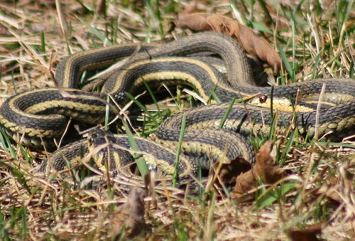 It was a mating ball, of course. Male snakes emerge first, in the early spring, as temperatures begin to rise and the hibernacula where the snakes spent the winter begin to warm. Usually a couple of weeks after the first females begin to come out. She broadcasts a pheromone as she goes about her routine, which very quickly attracts nearby males.
