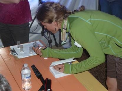 (Identifying a moth for a couple of the event attendees. I’m holding a bowl of ice cream in my other hand. They make their own maple syrup at the EIC and we were invited to try some, served over vanilla ice cream. It was delicious. Photo by Darrin O’Brien)