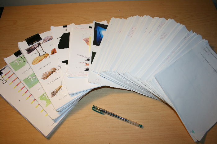 Here are all the different components of the book, sent to us for our review of the copyeditor’s mark-up. From left to right: the graphics illustrating the flight period for each species, the range maps for each species, the plate images, the endplate (inside-cover) silhouettes, the terminology diagrams for the introduction and the endplates, the photos for the introduction, and then the full manuscript, including the intro and end materials and the species accounts themselves. Each species has components in five spots (flight period, map, image, species account, checklist entry) and trying to keep track of everything can get a little confusing!
