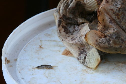 This is the image, cropped to 100% – as close as I could get. I’ve been having some trouble with my camera card reader on my computer – it works, but takes some patient fiddling with – so I didn’t check them out closely right away. On the back of the camera, though, they kind of looked like tiny beetles, like maybe a nymph stage. I knew that beetles have a worm-like grub stage, and I’d already observed worm-like grubs, so that’s what I figured they were. Beetles. Just needed to wait till they grew into adults to find out what type.
